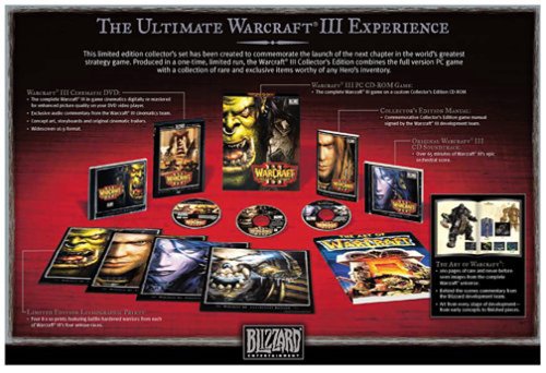 Also included is the WarCraft III soundtrack CD, a commemorative collector's edition manual signed by the WarCraft III development team, and four limited-edition 8x10 prints featuring rich artwork portraying battle-hardened veterans from each of WarCraft III's races.