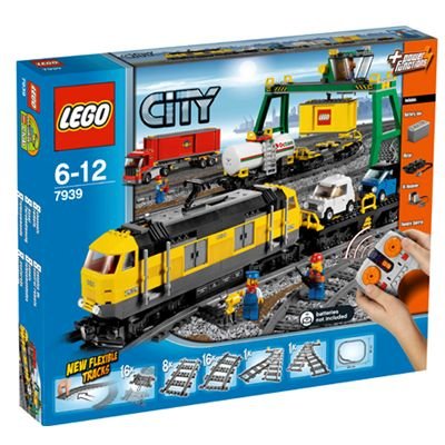 Load up the Lego City - Cargo Train 7939 and send it along the tracks. The Cargo Train is the fastest way to transport goods around Lego City. Use the included track set to construct a track around Lego City. Help the 3 worker minifigures and load or unload the containers using the working big crane . The canopy of the train engine can be removed to reveal the driver's cabin and has space for the train driver minifigure. The trains can be controlled by you remotely , the 4 channel, 7 speed infrared remote allows you to drive up to 8 different trains at once! The Cargo Train comes with a full set of tracks including 2 switch tracks, 8 straight tracks, 16 curved tracks and 16 flexible tracks that can be used as straight or curved tracks. Also included are 4 minifigures , a trains driver and 3 freight workers, as well as a working crane and a train with an engine, tank wagon, flatbed container wagon and an autowagon with 2 cars. In all the train measures over 34 inches in length , approximately 88cm long! Trains can be driven remotely due to the Lego Power Functions battery box, infrared receiver, medium motor and 4 channel, 7 speed infrared remote control. The Lego City - Cargo Train 7939 is an excellent way to encourage imaginative play. Please Note: Train is compatible with Lego 9V tracks, Tracks are NOT compatible with Lego 9V trains.
