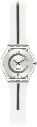 Silver dial with black hands and transparent case. Transparent strap with black stripe. From the Swatch Swiss Watch collection.