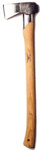Gransfors Bruks Large Splitting Axe Designed for splitting chunks of wood, "rounds". The axe head is quite heavy with forged cheeks on both sides of the blade, "splitting wedge shaped crests" which power apart the grain of the wood. A Splitting Axe does not just have to slice into the wood, the thick axe blade pushes apart the wood. Not for sale to any one under 18 years old. The poll of this axe, like the poll on most axes, is definitely not designed for heavy pounding on a wedge. The axe has a 3" face and a 70cm hickory handle and the head weighs 2.4 kg. We will age verify all purchasers - do not order if you are under 18