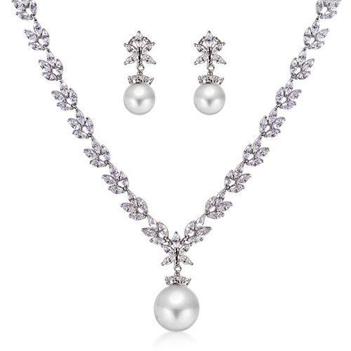 This bridal necklace and earrings set is an exquisite combination of white gold-plated alloy and over 60 dazzling marquise-cut diamond CZs in 2-prong setting. Both items feature an iridescent south sea shell pearl centerpiece for an elegant look. The necklace is 18.5 inches in length and has significant weight. Its drop pearl dangles elegantly at 1 inch from its diamond CZ-studded links. The earrings are also in a drop motif, and feature the same sensational south sea shell pearls and a push-back closure to ensure maximum functionality. Preparing for that special day, or know someone who is? Then purchase this sophisticated set that's as timeless as your celebration. Earrings are for pierced ears only.