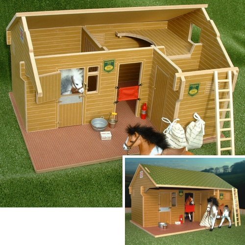 Equestrian centre is a truly unique and beautiful wooden toy that must represent the ultimate in toy equestrian centres. Everything you need for your horses and ponies is included in the set. It is built to the popular 1:12 scale and incorporates a stable, open stall, tack room, hay loft and when the two roof sections are removed they form a large sand-school area for that dressage practice. Features include: 2 realistic flocked horse with silky mane and tail, English saddle with metal stirrups/bridle and reins, 1 metal bucket with wooden handle, 1 metal feed bowl, 1 metal first-aid box, 1 metal fire extinguisher, 1 sack of horse feed, 1 sack of horse bedding, 1 hand made stall guard, 2 saddle racks, 1 bench and 4 clothes hooks in tack room, 1 ladder, split stable and tack room doors with real hinges and catches. Assembly required.