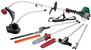 Expert quality, Five attachments for different tasks around the garden, two-stroke petrol engine, Choke for easy starting, On/off switch with safety throttle lever and lock for starting, Split shaft for ease of transport, Adjustable D type handle, Single strap shoulder harness with quick-release mechanism. Supplied with attachments; brush cutting, pruner cutting, blower, hedge trimmer, grass trimmer and extension pole 650 mm long