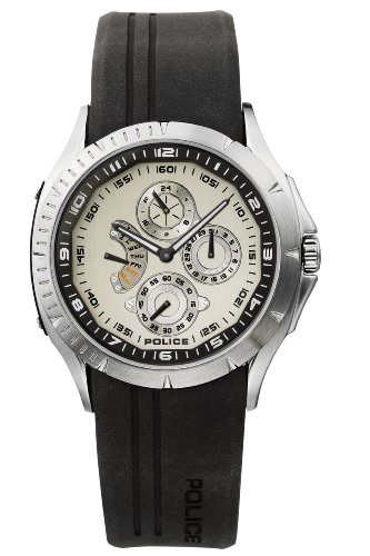 A stylish Police watch with a black rubber strap the silver watch face has a date day second hand as well as a separate area to give the time in a hour clockComes complete with official police guarantee and Police packaging presentation box
