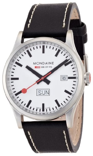 Mondaine Gents Black Leather Strap Watch A6673030816SBB Mondaine the official timekeeper of the Swiss Federal Railway have created a wide range of timepieces based on their iconic design. From automatic strap watches to steel bracelet sports watches the face that can be seen over 3000 times across the Swiss railway network is incorporated into a smart original design that is sure to get conversation going when on your wrist. Product Description : - Quartz analogue movement - White dial with batons - Date/day function - Stainless steel case - Black leather strap Also Comes With : - Two year Mondaine Guarantee (Terms and conditions apply) - Presentation Watch Box